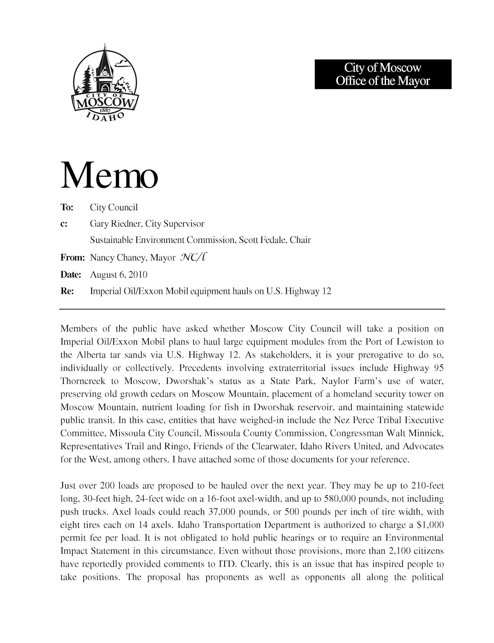 Memo From Moscow Mayor Chaney to Moscow City Council